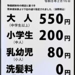 2026年2月13日 / 最終更新日 : 2026年2月13日 世安湯 おしらせ 令和8年2月16日より 入浴料金改定について 平素より 世安湯を ご利用いただき、誠にありがとうございます。 このたび、燃料費や 電気料金等の高騰 ならびに 諸物価の上昇に伴い、熊本県公衆浴場統制料金の改定が行われ、入浴料金を 改定させていただくこととなりました […]
